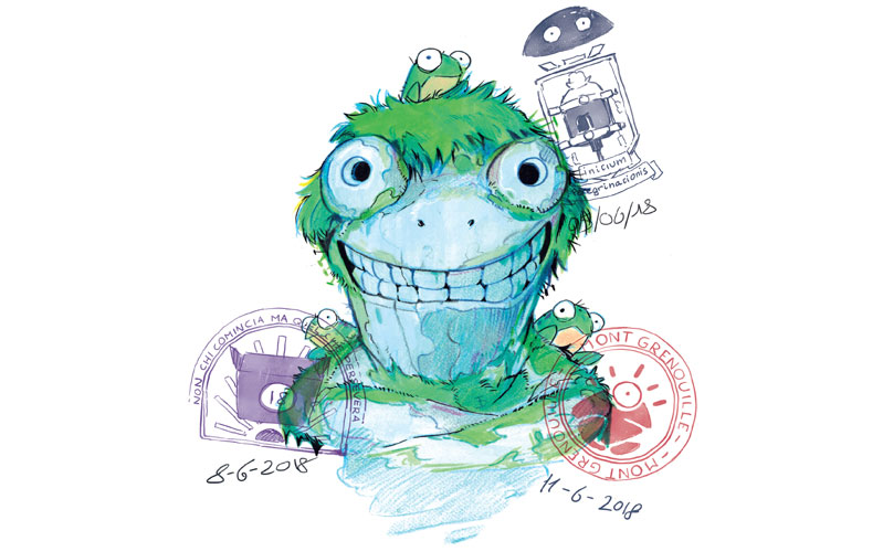 Pris d'une irrésistible envie de l'attraper, il tente de la ramasser, en vain. Sa course-poursuite l'entraîne au bord d'un étonnant lac asséché et couvert d'herbe dans lequel il s'enfonce inexorablement avant d'atterrir devant la Maison Croâ Croâ : une laverie automatique ornée d'une majestueuse tête de grenouille !