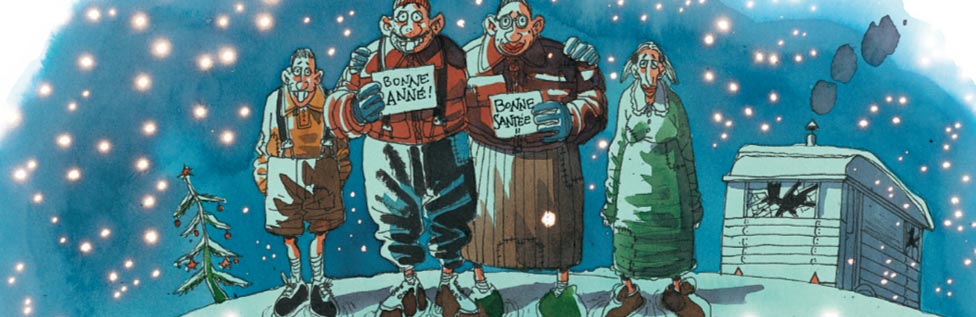 Beeld je dit eens in: op elke dag die de goede God schiep, en zelfs op de dagen die hij níét schiep, vieren de mensen Kerstmis. Punthoeden, serpentines en confetti verplicht. 't Is féést, weet je wel? Ze hebben lol, ze maken plezier, ha ha ha! Laat je gaan, tante Sjaan! In feite is het een dwangfiësta, even spontaan als de arbeid met diezelfde naam. Of je wilt of niet, elke dag vier je kerstavond tot diep in de nacht. Je móét.